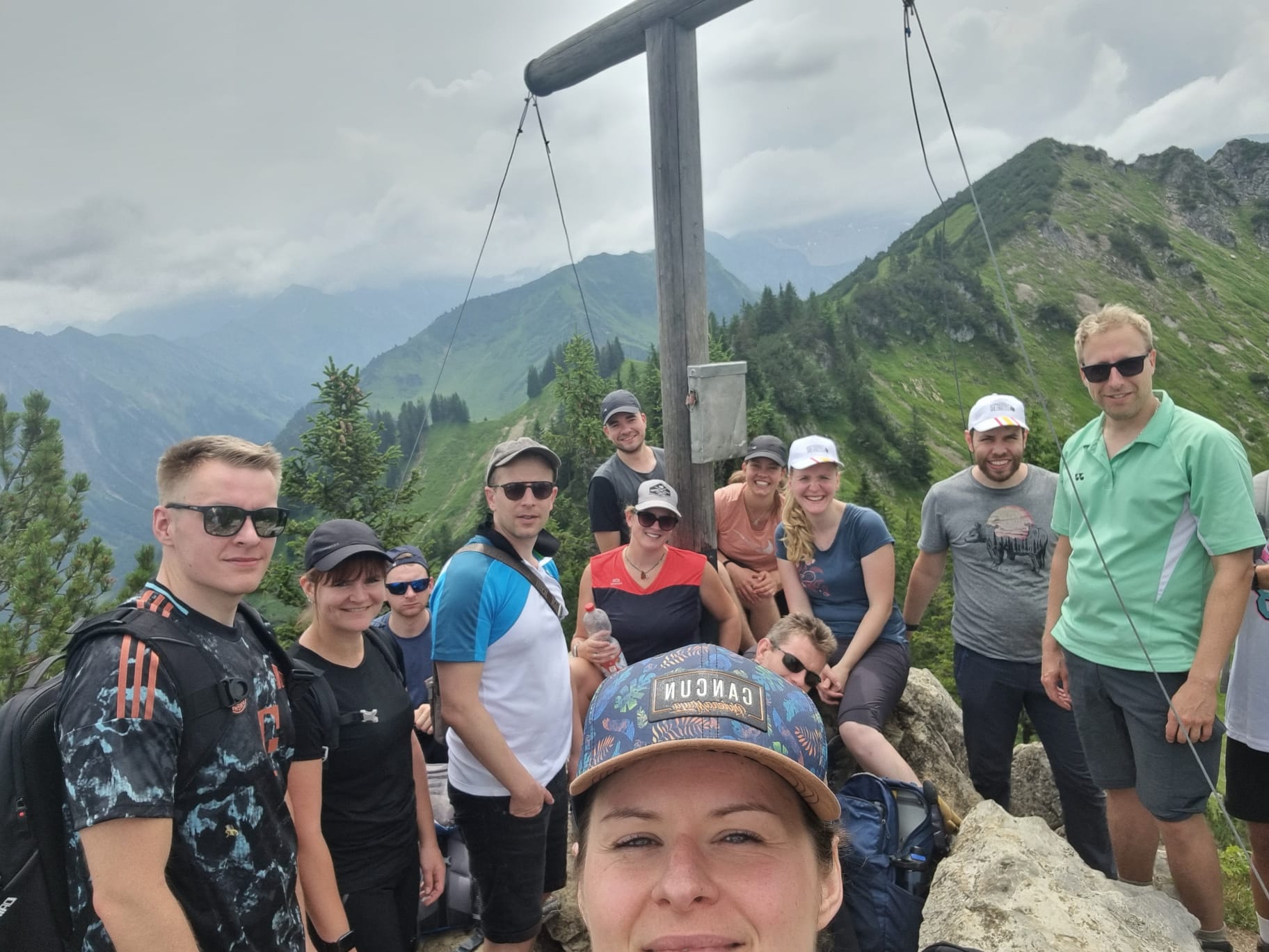 Der Samstag begann mit einem ausgiebigen Frühstück, bevor wir uns auf eine anspruchsvollere Wanderung machten. Unsere Route führte uns von Oberstdorf aus zuerst durch das Tal an der Trettach entlang. Anschließend ging es ca. 900 Höhenmeter bergauf auf das Hahnenköpfle. Von hier hatten wir einen herrlichen Blick ins Tal. Sogar das Nebelhorn konnten wir aufgrund der klaren Sicht erkennen. Nach Erreichen des Gipfels ging es wieder bergab. Hier bot sich eine Alpe zur Einkehr an, bei der wir das ein oder andere Getränk sowie eine Kleinigkeit zu uns nahmen. Die Oytal-Hütte war nun unser nächstes Ziel. Hierfür mussten wir nur noch das recht kurze aber sehr steile Reststück der Wanderung ins Tal laufen. Nach einer kleinen Erfrischung in der Oytal-Hütte, kam der belohnende Abschluss des Tages: Eine Rollerfahrt hinab nach Oberstdorf. Hierfür mieteten wir große Tretroller mit Luftbereifung und fuhren anschließend die letzten 6 km und ca. 200 Höhenmeter zurück ins Tal zum Parkplatz. Nach der langen Wanderung bei durchaus warmen Wetter kam uns der Fahrtwind gerade gelegen.