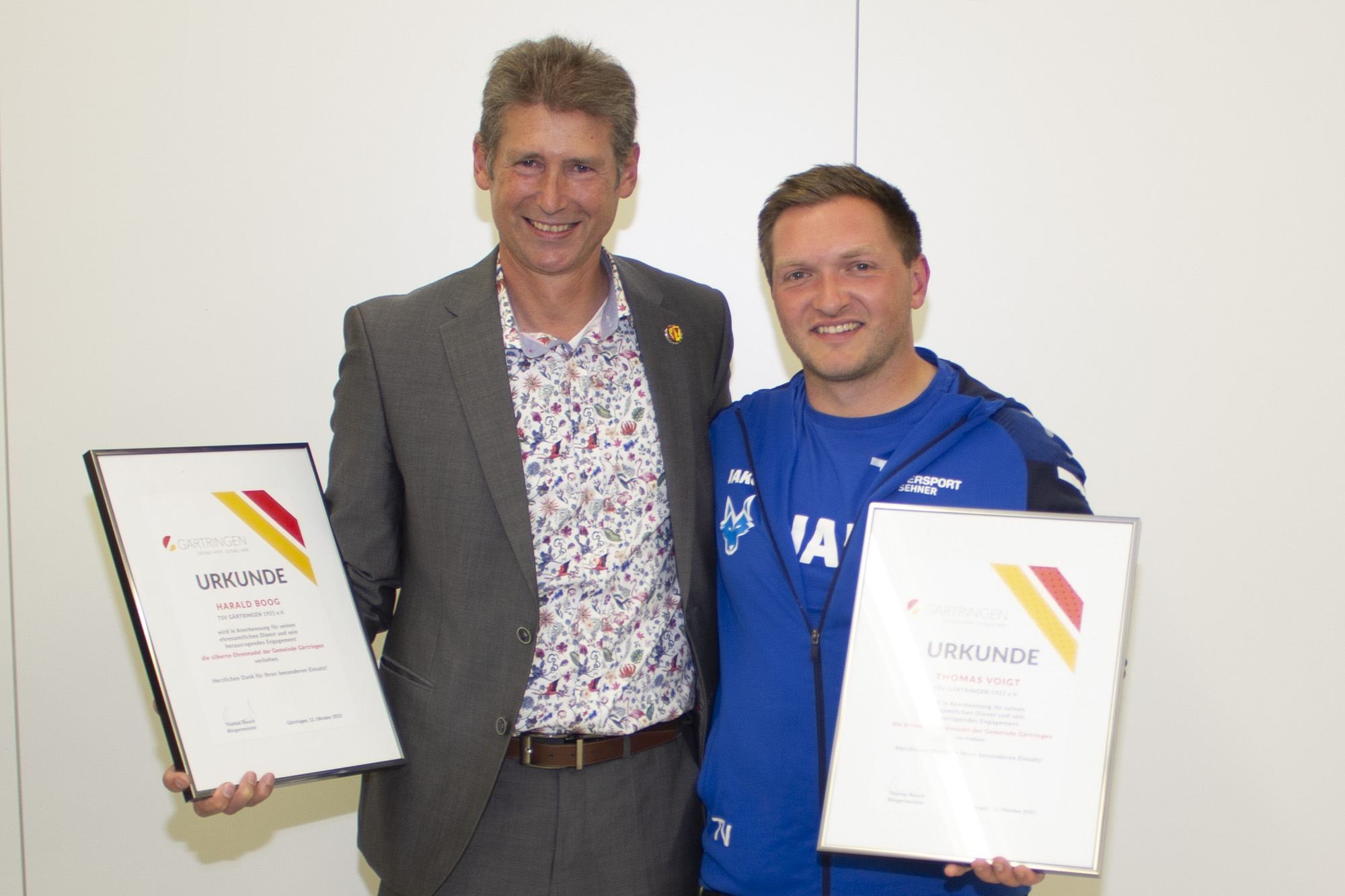 Beide engagieren sich bereits seit vielen Jahren im TSV Gärtringen u.a. in der Abteilung Faustball als Trainer und Ausschussmitglieder. Harald Boog aktuell auch als stellvertretender Abteilungsleiter Faustball und Thomas Voigt zusätzlich noch auf Verbandsebene als Trainer der männlichen U14 Auswahl im Schwäbischen Turnerbund (STB) sowie einige Jahre als Vizepräsident Jugend des TSV.