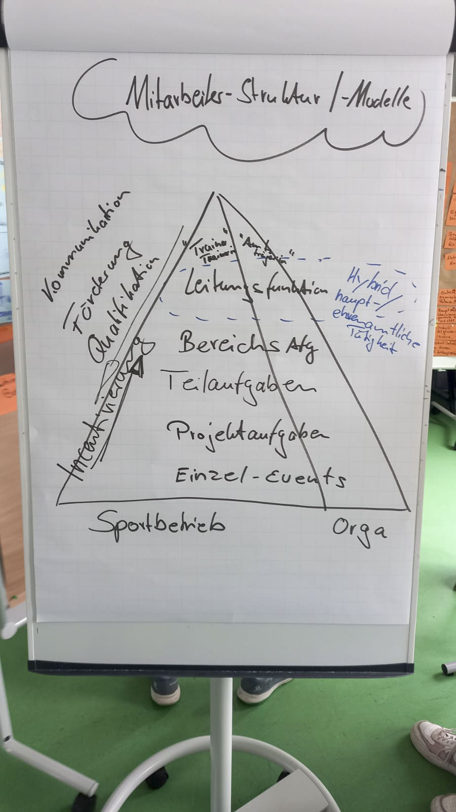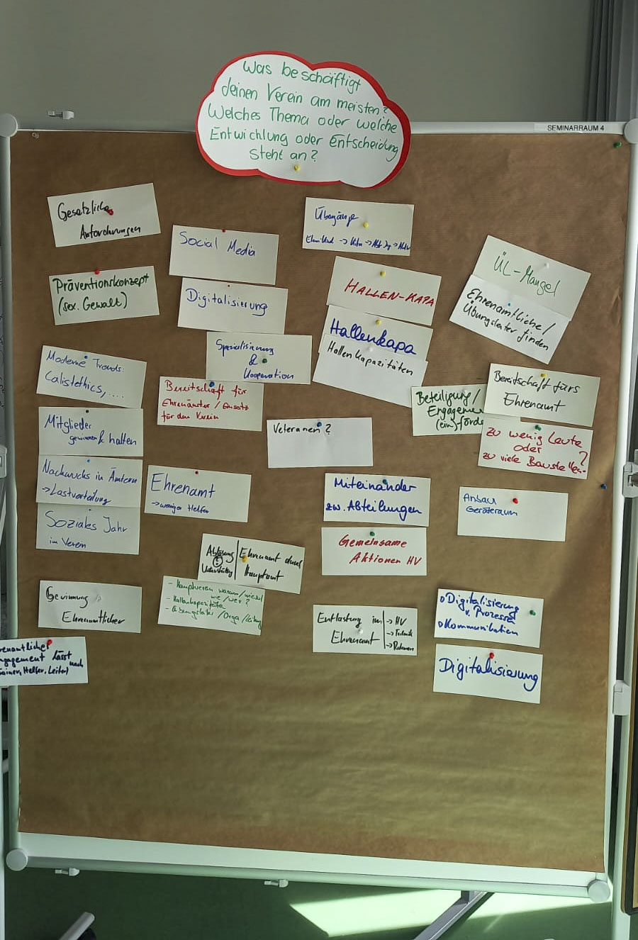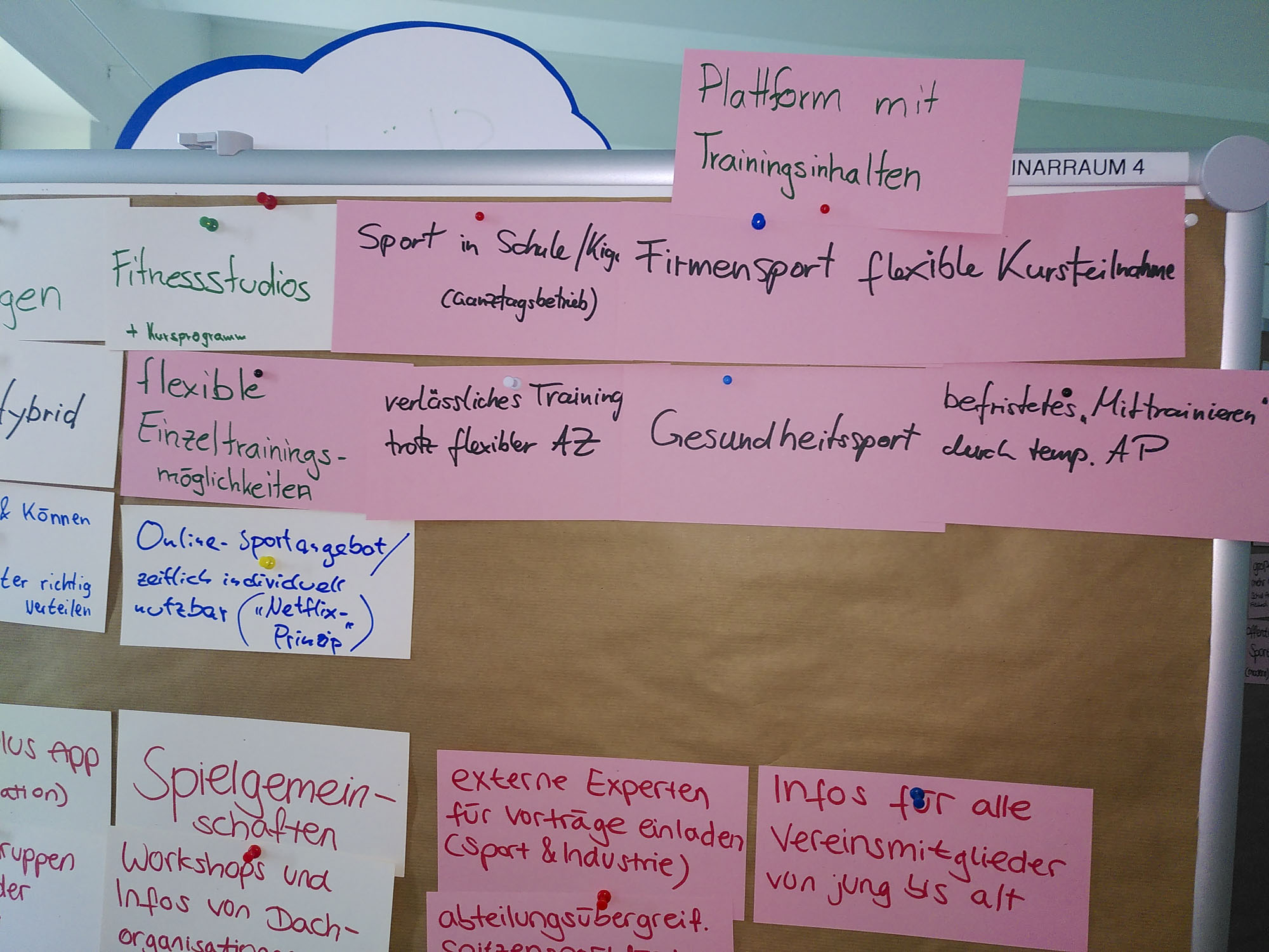 Unsere TSV-Gruppe einigte sich darauf, am zweiten Tag die Punkte "Kommunikation & Identifikation" und "Mitarbeitende des TSV" in zwei Gruppen genauer zu betrachten. Da das Thema Digitalisierung bereits behandelt worden war und dies in allen Bereichen eine Rolle spielt, wollten wir unseren Fokus lieber auf ein anderes wichtiges Thema lenken.