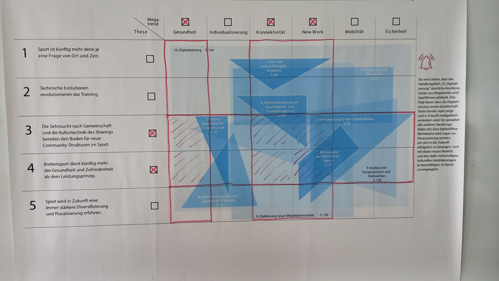 Am Nachmittag betrachteten wir dann die aktuellen Megatrends in der Sportgesellschaft sowie die "5 Thesen zur Zukunft des Sports". Anhand dieser Megatrends und Zukunftsthesen ergaben sich zehn Handlungs- und Entwicklungsfelder. Für uns waren vor allem die folgenden fünf Entwicklungsfelder relevant: