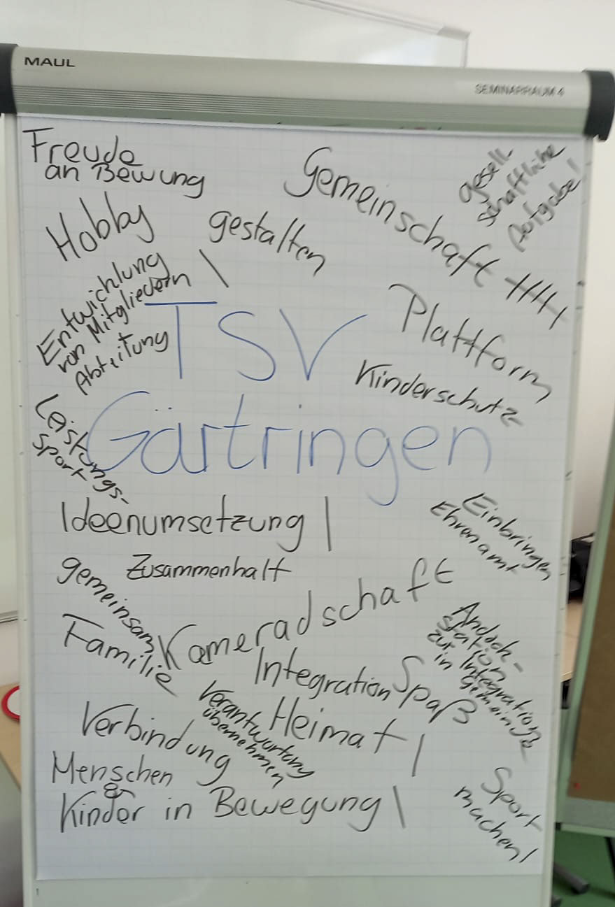 Mit einer gemischten Gruppe aus Jugendlichen, älteren und neuen Mitgliedern starteten wir, 17 TSV-Mitglieder, am Samstag um 9:00 Uhr an der Landessportschule Ruit in den Workshop "Sportverein 2030". Ziel des Workshops war es, die aktuellen Trends zu beleuchten und Themen anzusprechen, die den Sportverein gegenwärtig und in Zukunft beschäftigen. Zu Beginn des Workshops stellten sich unsere Workshopleiter Kathi und Dirk (STB) vor, bevor wir eine Vorstellungsrunde durchführten, in der wir erwähnen sollten, was für uns der TSV Gärtringen bedeutet. Am häufigsten fielen dabei die Worte Sport und Gemeinschaft & Zusammenhalt. Anschließend beleuchteten wir in Kleingruppen die Stärken und Schwächen unseres Vereins. Insbesondere wurde die ehrenamtliche Arbeit in den einzelnen Abteilungen und die Synergieeffekte der hauptamtlichen Geschäftsstelle als Stärke angesehen. Als Schwächen haben wir neben den offensichtlichen Hallen/Sportraum-Kapazitäten auch die Kommunikation mit den Mitgliedern und die Identifikation der Mitglieder mit dem Hauptverein identifiziert.