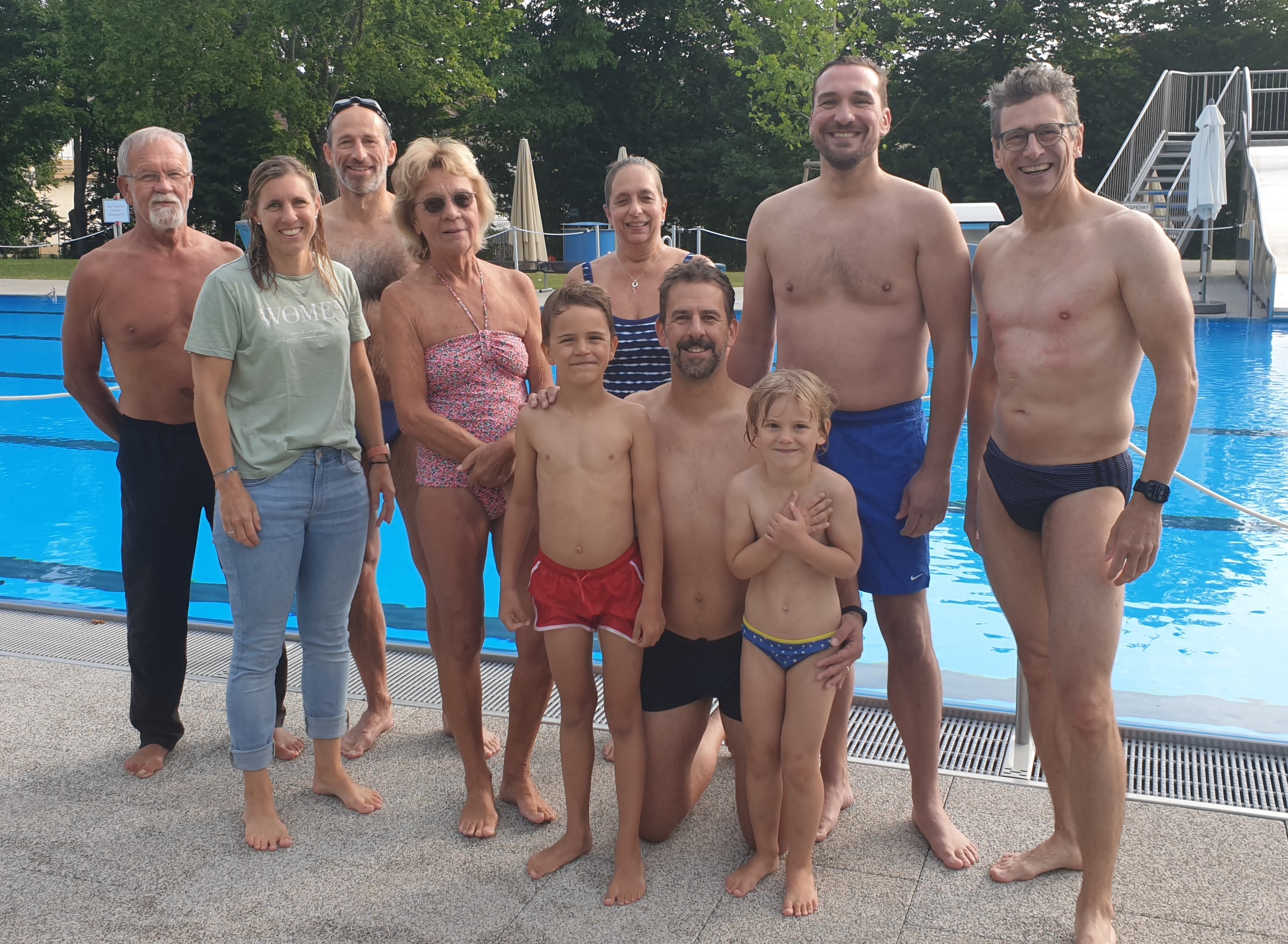 Am vergangenen Donnerstag fanden trotz der tropischen Hitze 9 Teilnehmer ihren Weg zur Sportabzeichenabnahme und auch einige der Prüfer nutzten den geringeren Andrang, um auch ihre eigenen Disziplinen anzugehen. Bei unserem zweiten Schwimmtermin im Hildrizhauser Freibad am vergangenen Samstag (unser Dank gilt Schwimmmeister Benjamin Buttafoco, der uns dies wie bereits im letzten Jahr ermöglichte) war die Luft zu der frühen Stunde um 7.30 mit ca. 15 Grad und noch ohne Sonne nach den heißen Tagen ungewohnt frisch. Das Wasser war mit ca. 26 Grad jedoch eine Wucht und alle 19 Teilnehmer genossen es, ihre Bahnen zu ziehen. Nach den Schwimmdisziplinen, v.a. der Kurstrecken, zog es jedoch einige gleich wieder nach Hause ins Warme, weshalb auf dem Foto nur ca. die Hälfte der durchweg erfolgreichen Schwimmer zu sehen ist.