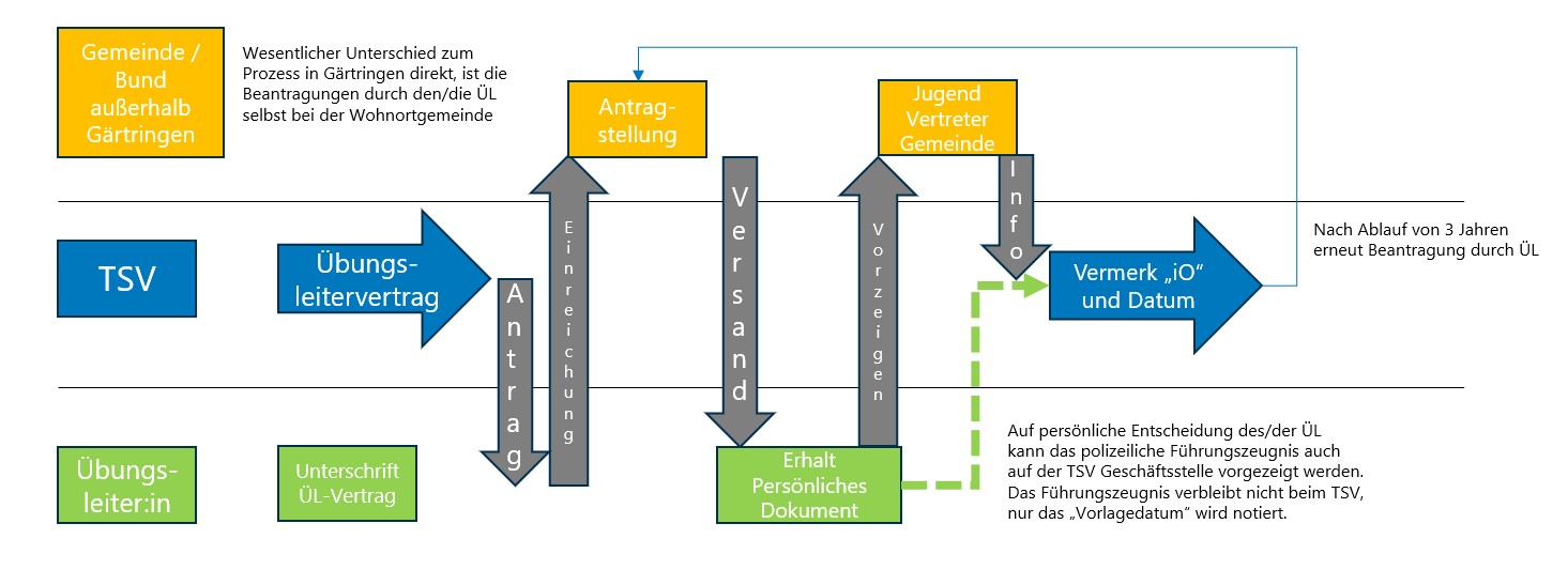 - Nicht in Gärtringen gemeldete Personen müssen persönlich beim Einwohnermeldeamt ihres Wohnortes unter Vorlage des Personalausweises oder Reisepasses den vom TSV ausgefüllten Antrag vorlegen und dort das Führungszeugnis beantragen.