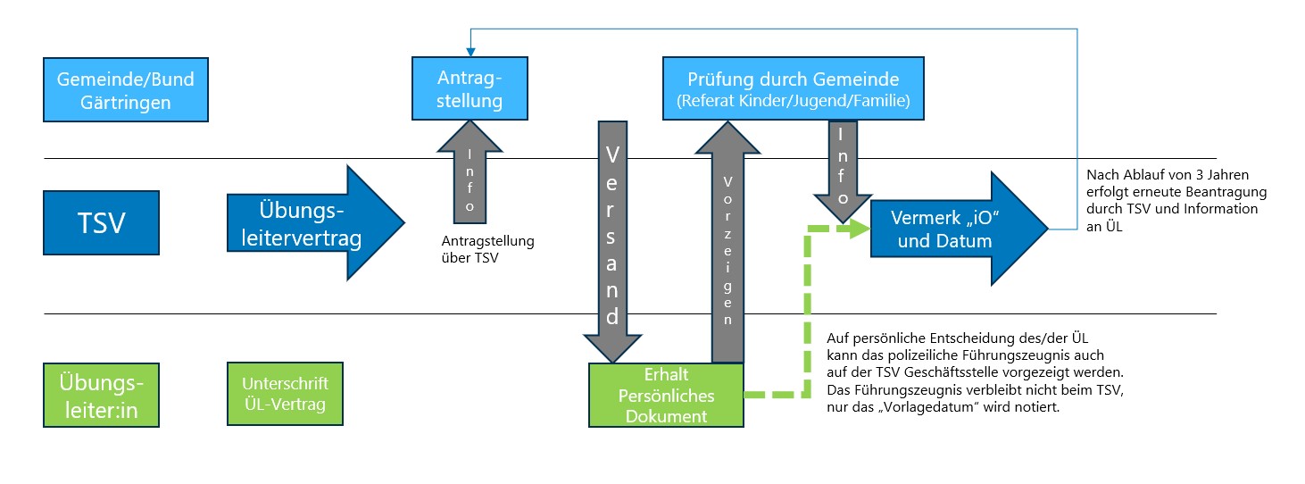Auf persönliche Entscheidung des/der ÜL kann das polizeiliche Führungszeugnis auch auf der TSV Geschäftsstelle vorgezeigt werden. Das Führungszeugnis verbleibt dabei nicht beim TSV, nur das „Vorlagedatum“ wird notiert. - Der TSV erhält vom Referat Kinder, Jugend und Familie zu definierten Stichtagen die Rückmeldung über die vorgelegten Führungszeugnisse.
